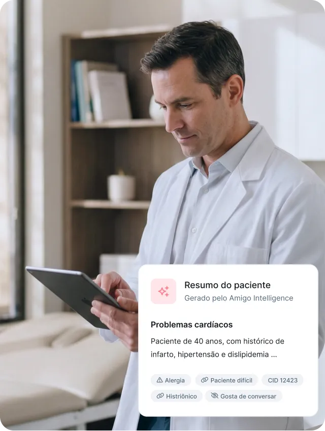 A Amigo Intelligence acompanha sua consulta e organiza o prontuário automaticamente para você focar no paciente.