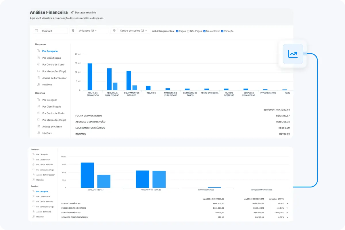 Para obter indicadores precisos, é fundamental que o dashboard esteja integrado às informações de outros setores da clínica. Esse cruzamento de dados permite resultados mais aprofundados e uma análise financeira completa da empresa.